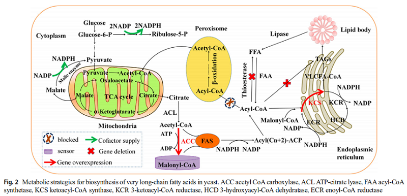 (2) Secondly, in yeast metabolic engineering, targeted or double-targeted NA biosynthesis pathways, such as mitochondria, peroxisomes, endoplasmic reticulum, Golgi apparatus and liposomes, may be an effective synthetic biological strategy. VLCFA was synthesized using acetyl coenzyme A and fatty acid activation form, lipid acyl coenzyme A and lipid acyl coenzyme A as substrates. In the production of neuroacids, it is very advisable to regulate glycolysis flux to fatty acid biosynthesis, especially to improve the level of precursors, delete competitive pathways and bypass the host to regulate metabolism. In addition, the production of VLCFA requires reducibility (NADPH) and energy (ATP) molecules, which are mainly derived from central metabolism. These factors can be balanced by redox engineering and can be applied to the production of neuroacids.